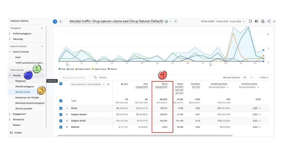 - Di tabel yang muncul, lihat kolom berjudul “Rasio Engagement”. Secara default, informasi ER yang disajikan meliputi rasio untuk akses direct, organic search, organic social, dan referral.