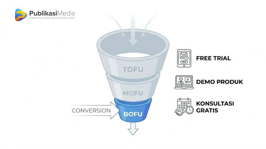 Terakhir, tahap BOFU adalah ujung corong yang paling sempit. Di sini, calon pelanggan sudah yakin dan hanya membutuhkan dorongan terakhir untuk melakukan action, yaitu pembelian.