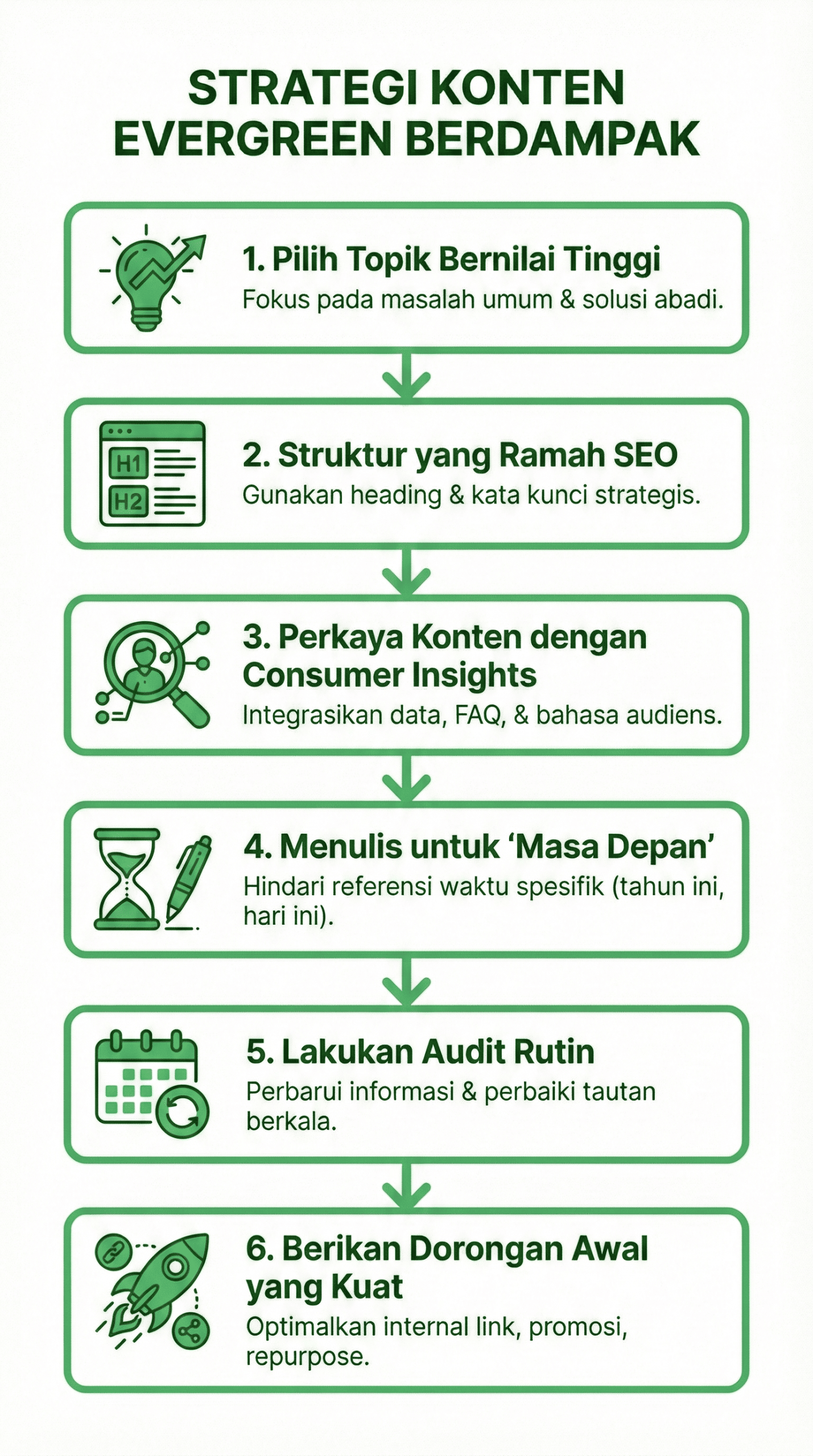 Konten evergreen seperti ini menjadi aset jangka panjang untuk strategi SEO maupun brand authority. Dengan memilih topik abadi, menulis konten yang berkualitas, serta memperbarui secara berkala, sebuah konten bisa terus mendatangkan traffic dan konversi.